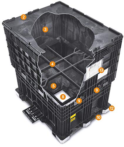 Einzelheiten: Der wiederverwendbare Fledbag Funnel Box von Buckhorn ist ein effizienter und vielseitigste Behälter, der für den Transport und die Entleerung von diversen Inhalten geeignet ist. Der Fledbag Funnel Box verfügt über einen glatten, schrägen Innenraum und einen großzügigen mittleren Auslauf, der eine sichere und vollständige Entleerung des Inhalts in nur 30 Sekunden ermöglicht. Seine hochbelastbare Kunststoffkonstruktion hält Lasten bis zu 1200 kg stand. Die Container lassen sich stapeln und verschachteln, um Platz zu sparen; seine modularen Abmessungen maximieren die Raumausnutzung des Anhängers, um die Frachtkosten zu senken. Tausende von Einheiten werden heute für den Vertrieb von Massenprodukten eingesetzt. Ihr einzigartiges Design sorgt für eine sicherere Arbeitsumgebung, spart Hunderte von Arbeitsstunden bei der Handhabung flexibler Massengutbeutel und reduziert die Verpackungs- und Entsorgungskosten.