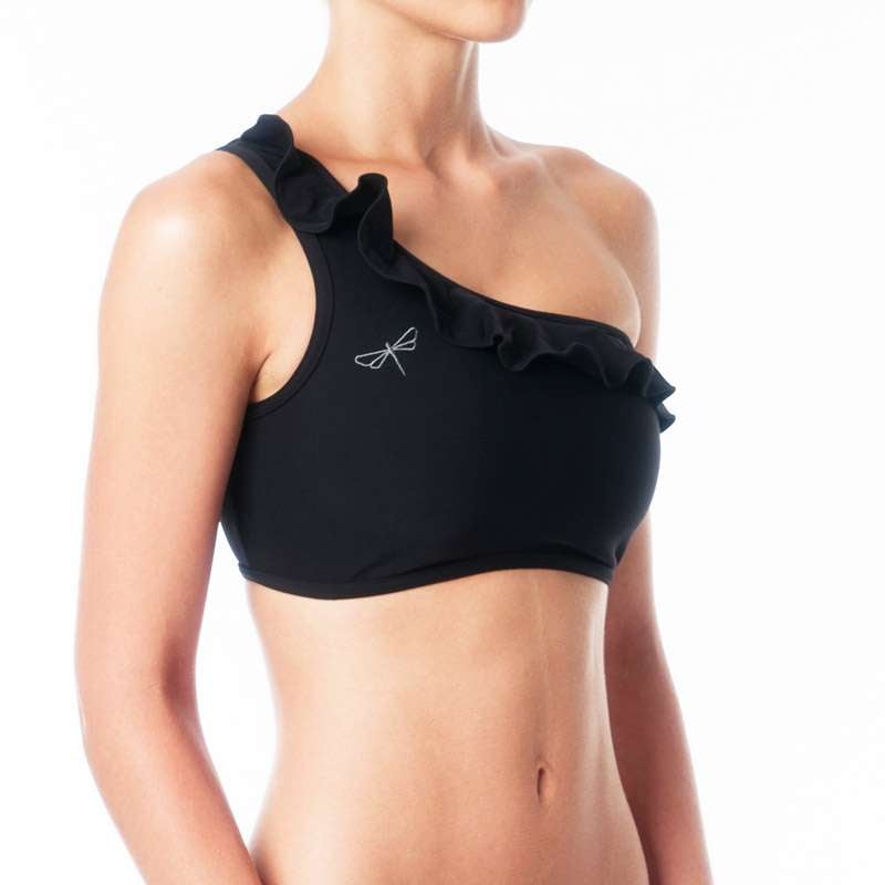 Carmen Sport-BH mit Rüschen bleibt perfekt an Ort und Stelle, auch wenn es sich um ein One-Shoulder-Top handelt. Libellen-Stickerei auf der Vorderseite unterstreicht das perfekte Design von hochwertiger Bikram-Yoga-Kleidung, Hot-Yoga-Kleidung und Pole-Kleidung. Das Rüschentop Carmen hat wie alle unsere Tops und BHs eine Doppelfront.