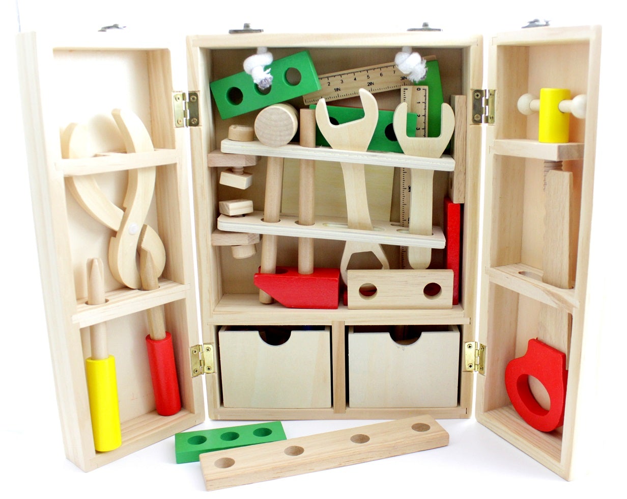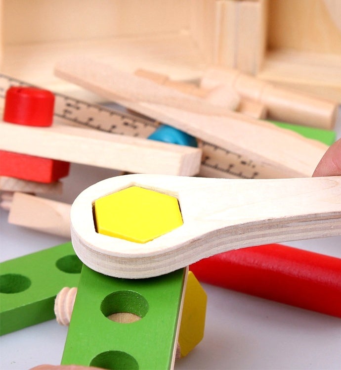 Mit unserem Werkzeugkoffer aus Holz mit 43 Werkzeugen und Zubehörteilen aus Holz sind Ihrem Kind keine Grenzen gesetzt.